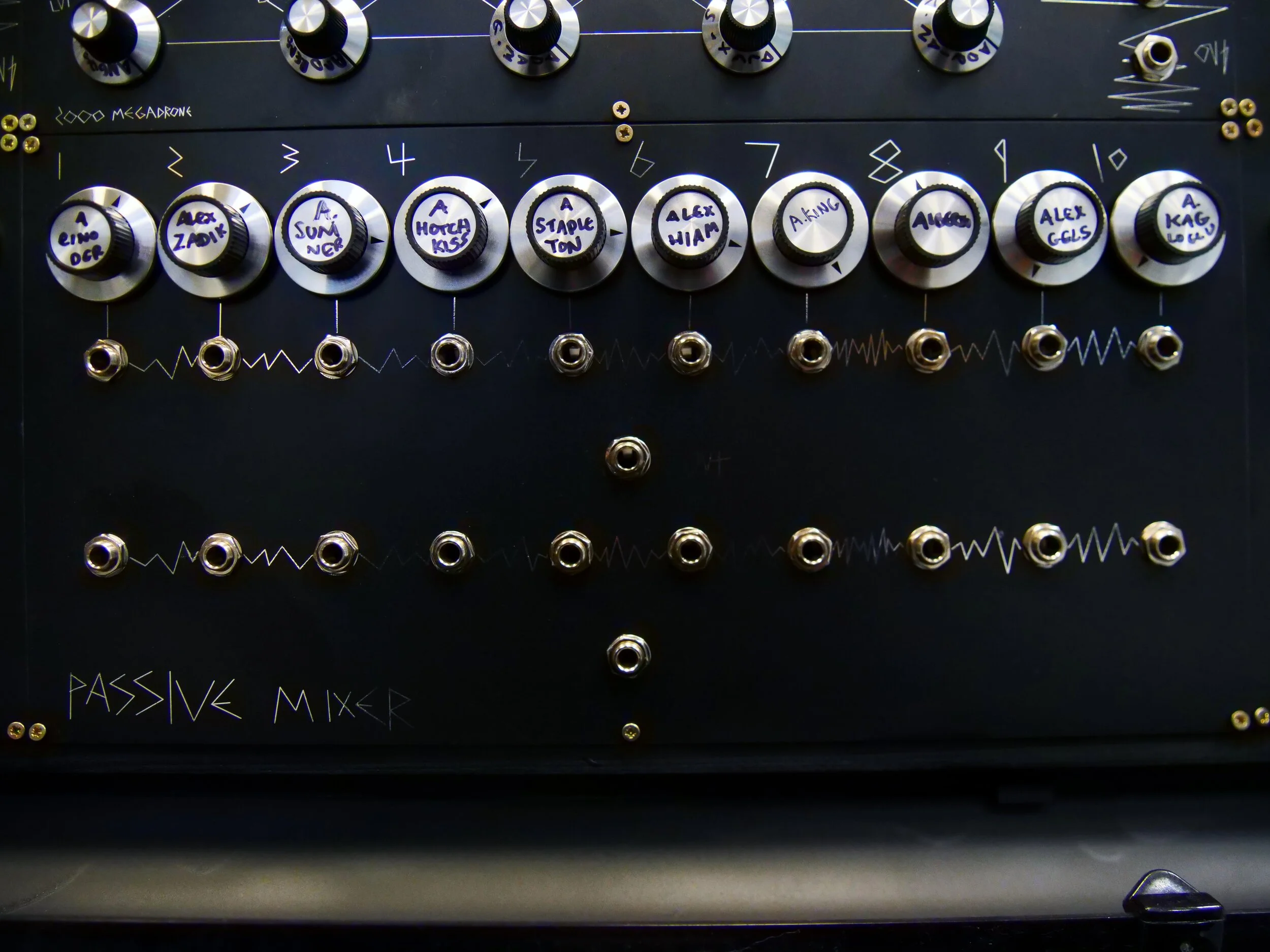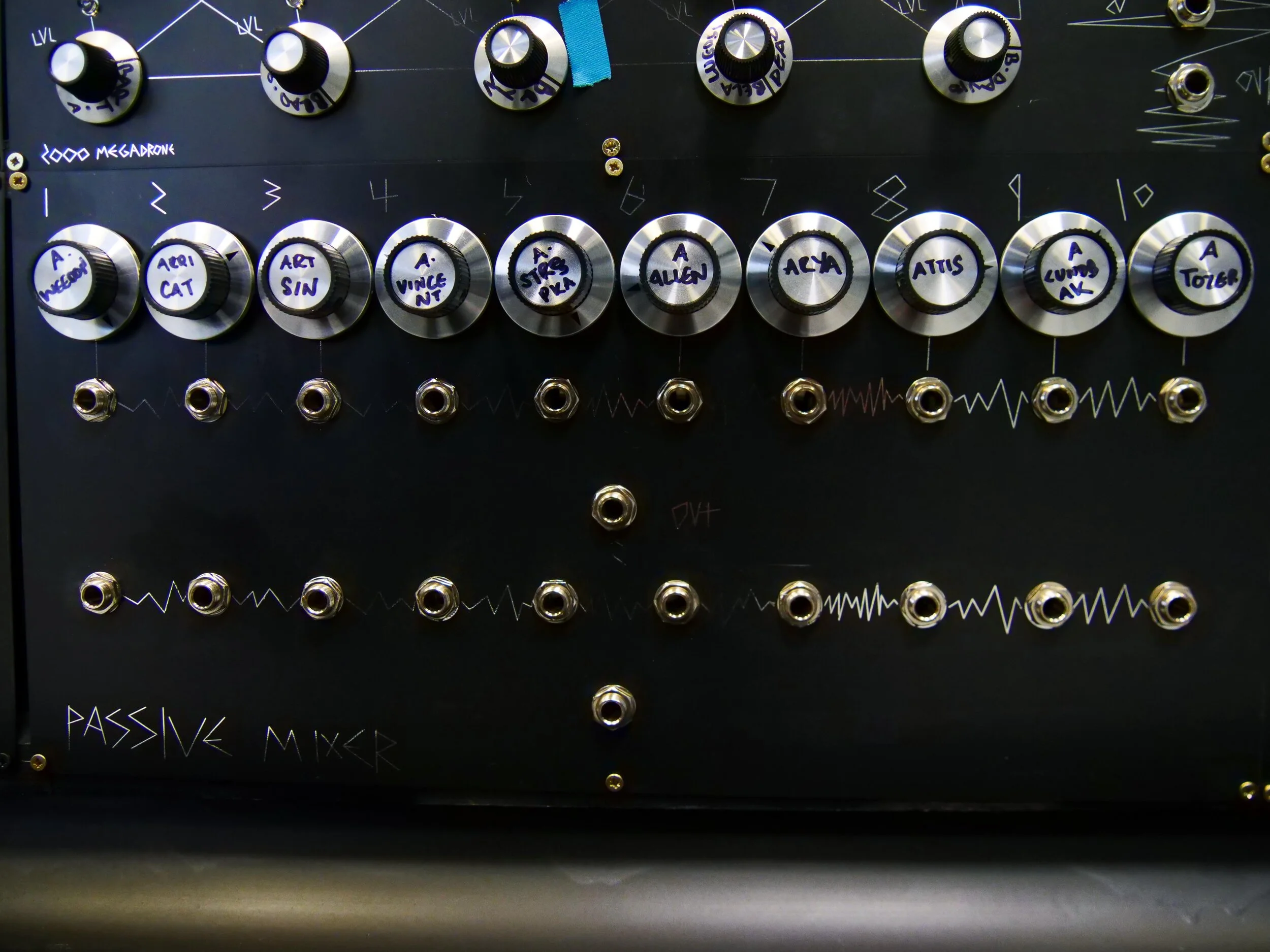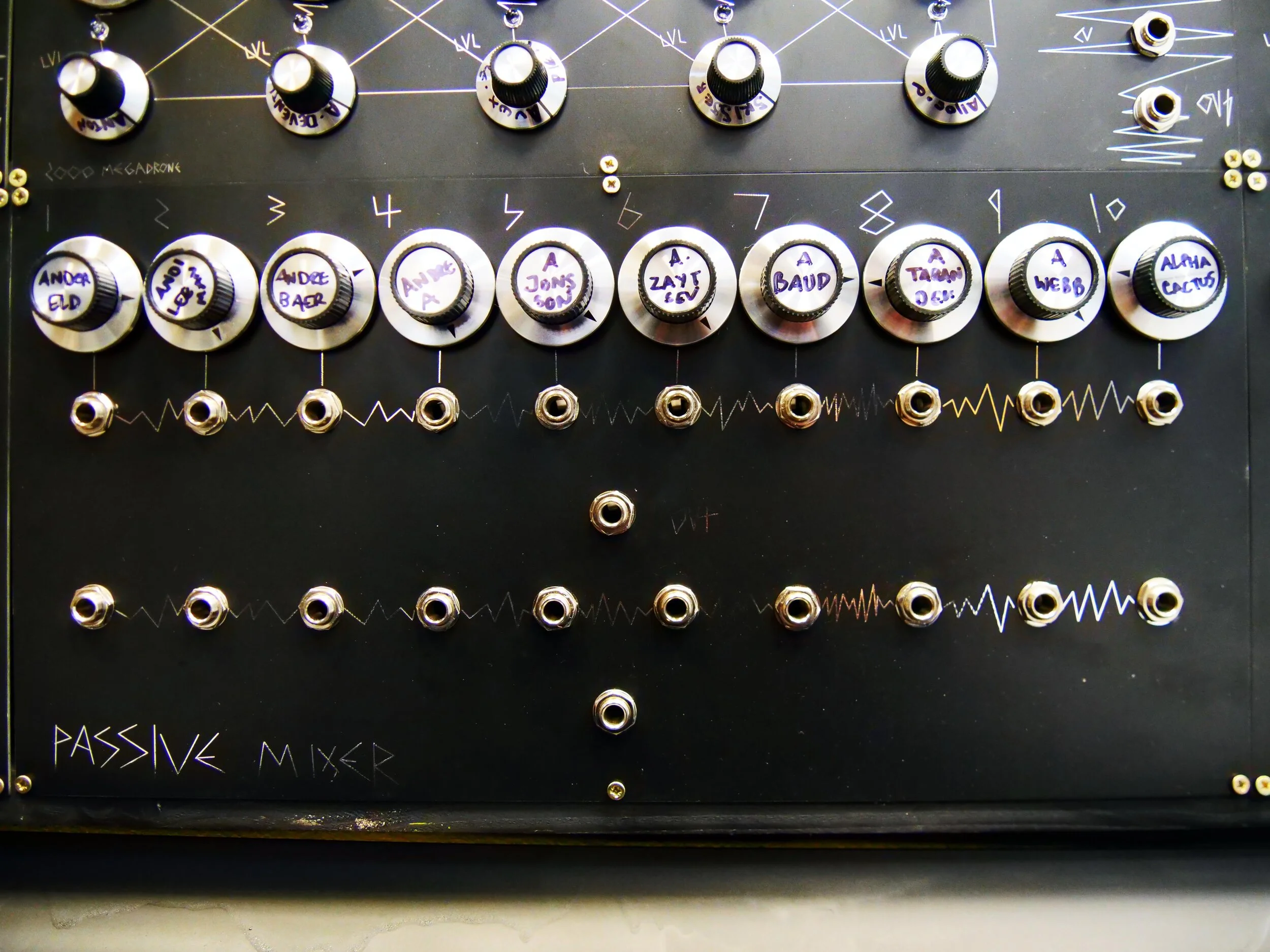The 1000 oscillator megadrone is an ongoing project nearing completion! Because its cost a fair chunk of dosh to get up and running i have written all my patreons who support the endeavour on the knobs. at the bottom of this page ill be adding a grid of where the pictures correlate to the 1000 oscillator megadrone. Also i will write out the full names of who is on the knobs at some point also. Big work in progress! if you want your name on one of the knobs! just sign up to my patreon and it will give me a notification so i can pop the name on it :). Below is the beginning of snapping the panels!