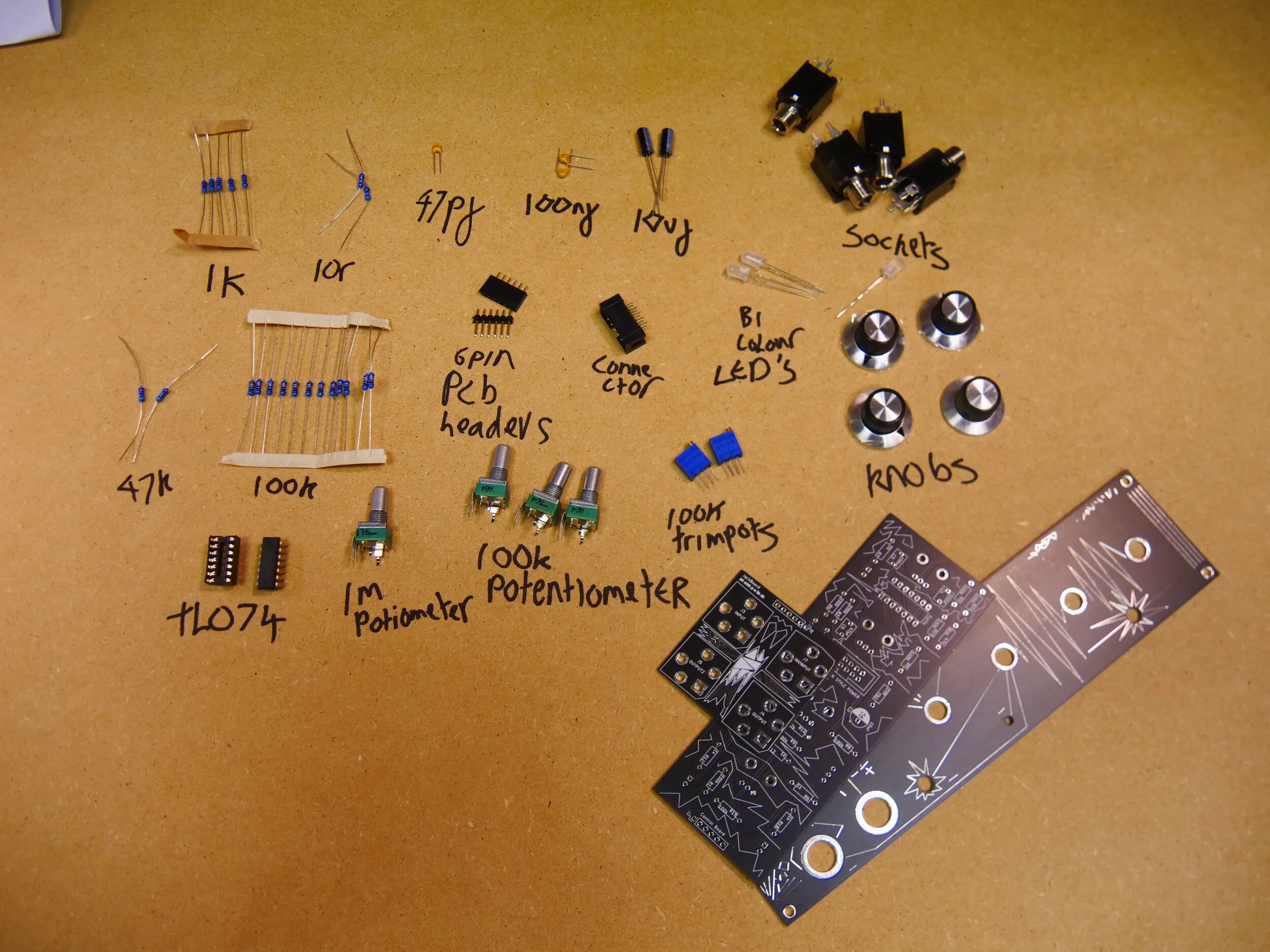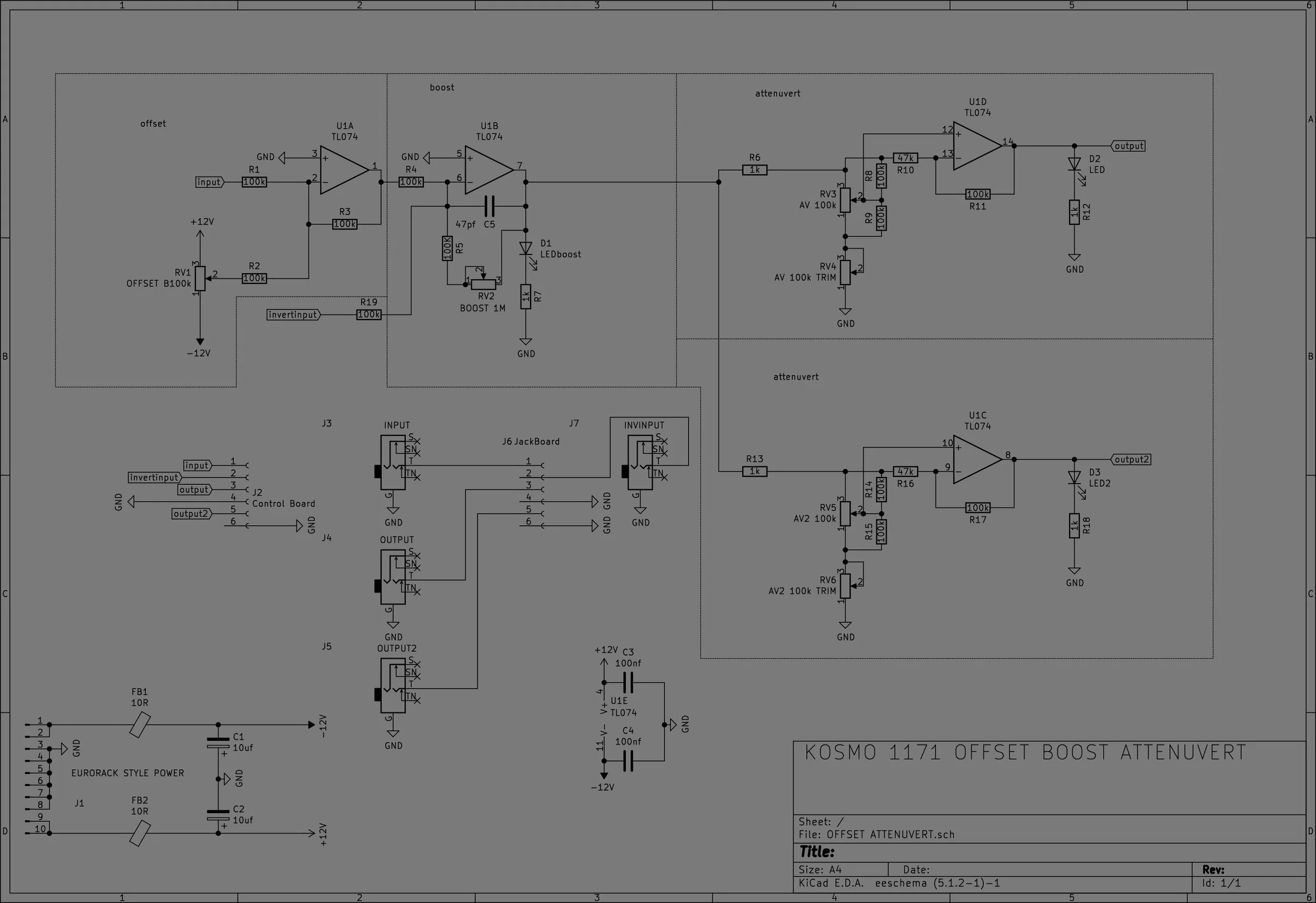 This module came from the power glove project where i needed to offset the signal coming from the signal and boost it. i figured id make it more funky. so you can plug in 2 signals into it. 1 going in none inverted, then another input is inverted but beyond the offset. then you can boost it up to 10 times its original level (unless it goes over 12v then it will clip off) then the signal gets split off to 2 seperate attenuverters giving you 2 different seperate outputs that are related but can be as different as you want them to be.