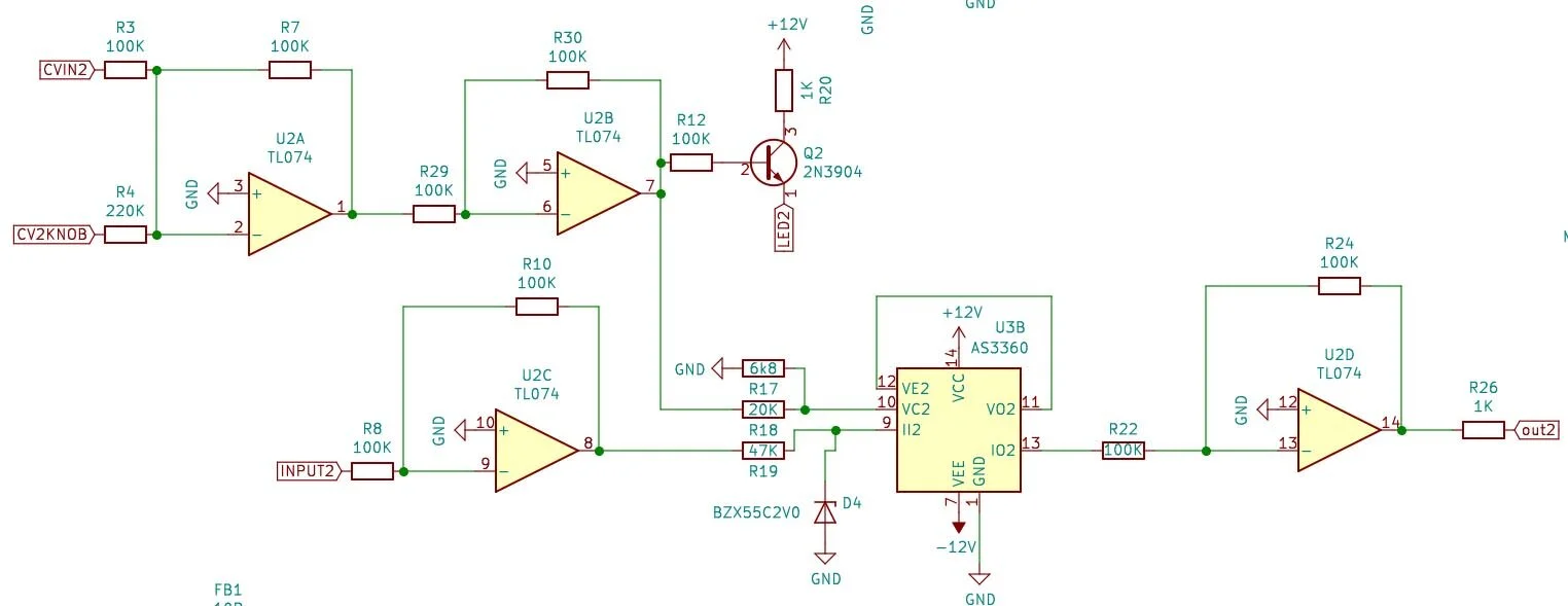 So this is a simple performance VCA based on the CEM3360 or AS3360 available from places like electric druid and soundtronics . This module has 1 of the 3360 chips in it. meaning you have 2 VCA’s as it is a dual VCA chip. check the schematic below :-