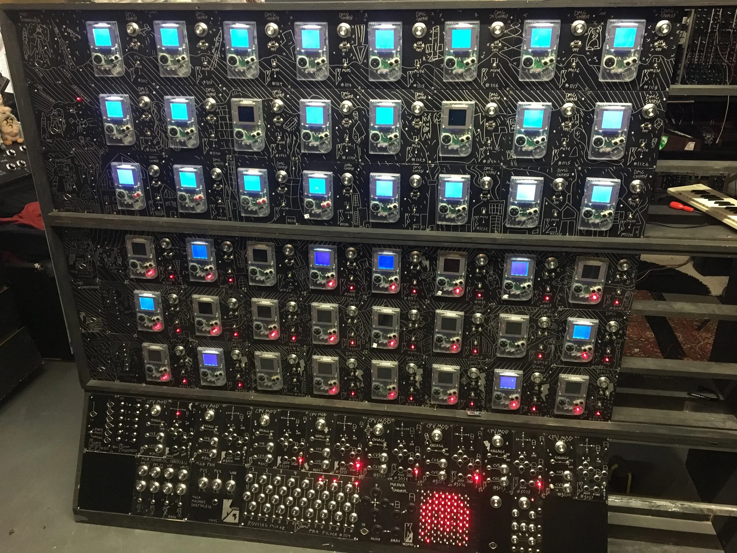 The other two sections to this! are basically just button controllers that send out 5v signals over to the circuit above to tell it to push a button on the gameboy. There are 8 slave controllers for controlling each column of gameboys. then there is a MASTER controller which is a big midi controller that tells all of the slaves to push buttons. so you can play all of the gameboys at once!!! it even has a midi input, i plan to make a single gameboy into a midi controller so i can use it to control all of the gameboys.