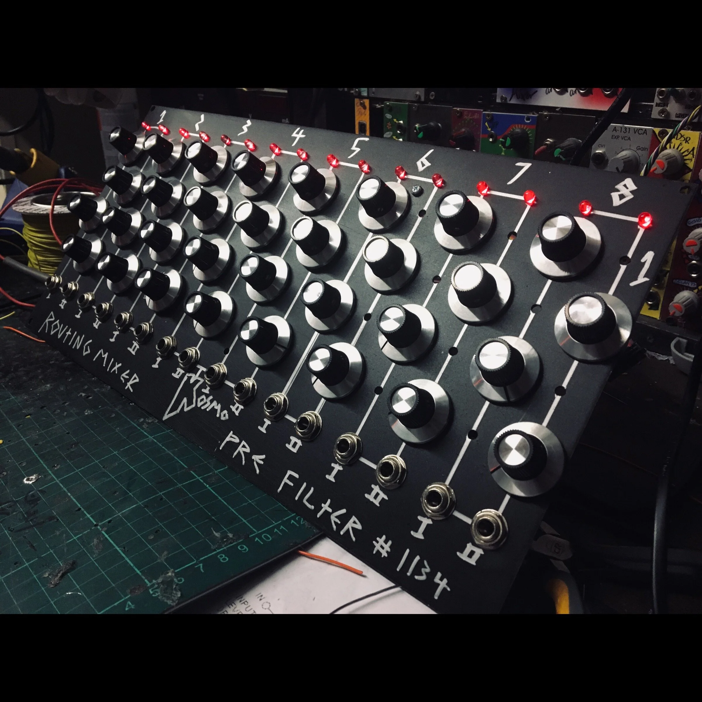 This is the panel to control the levels of all of the gameboys, all it does is send voltage to all of the VCA’s mixing signals from the CV inputs and the voltage offset using this schematig :- https://www.elby-designs.com/webtek/cgs/cgs04/cgs04_mix.html