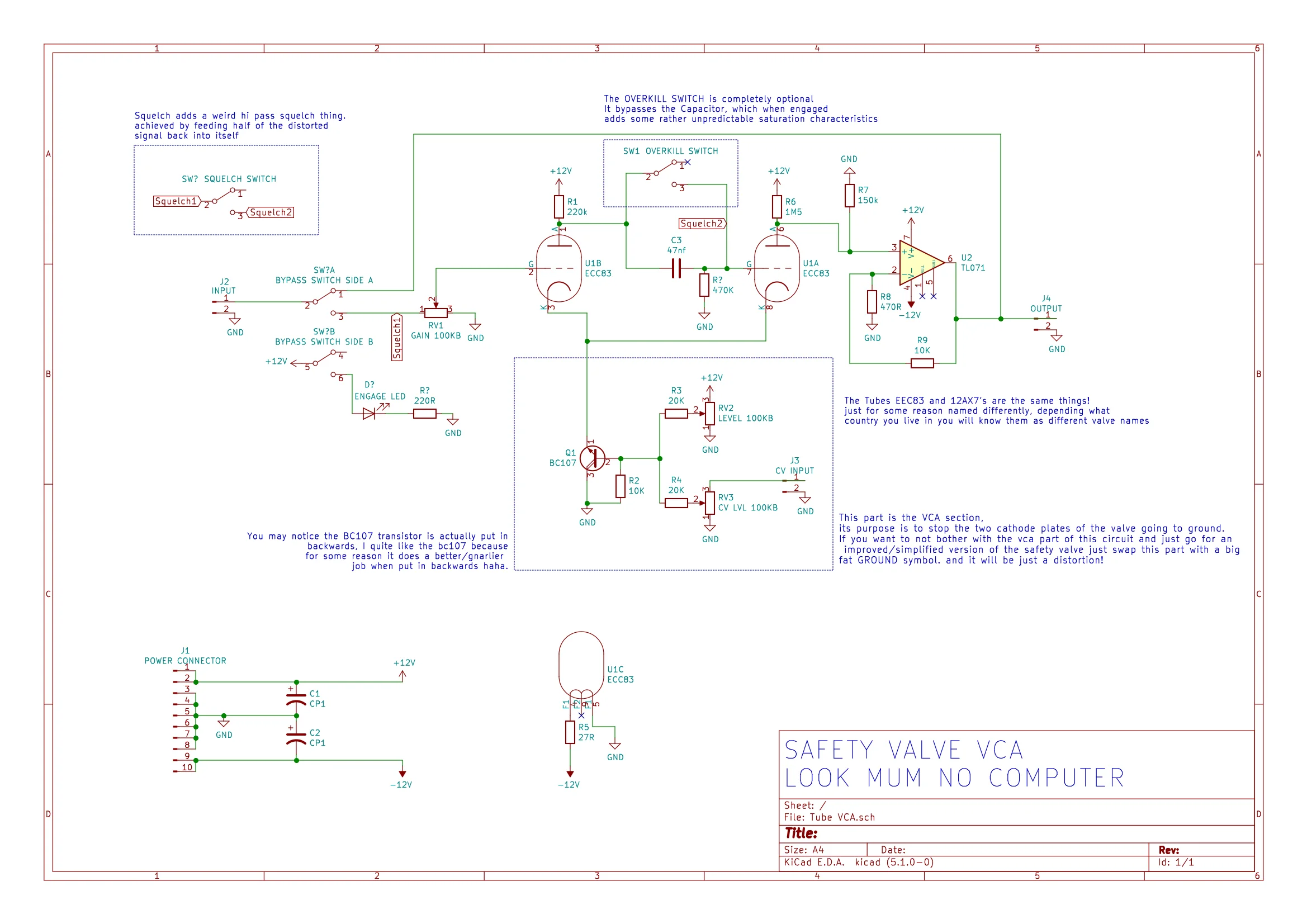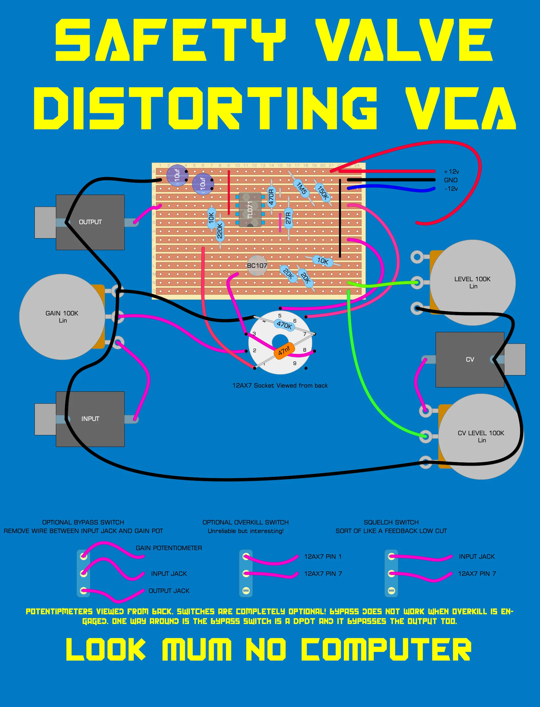 This is designed as a VCA, in the way that it has a transistor wired in backwards to stop its cathode plates going to ground, acting as a rather characteristic voltage controlled amplifier, below is schematic and stripboard. with some nice switch mods!