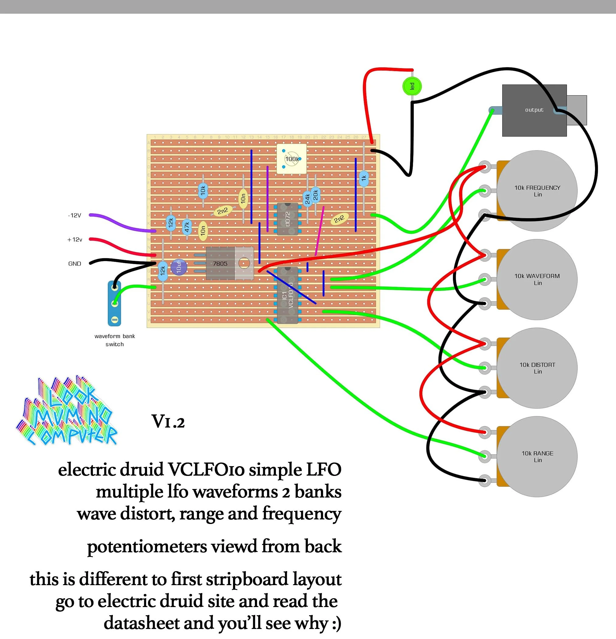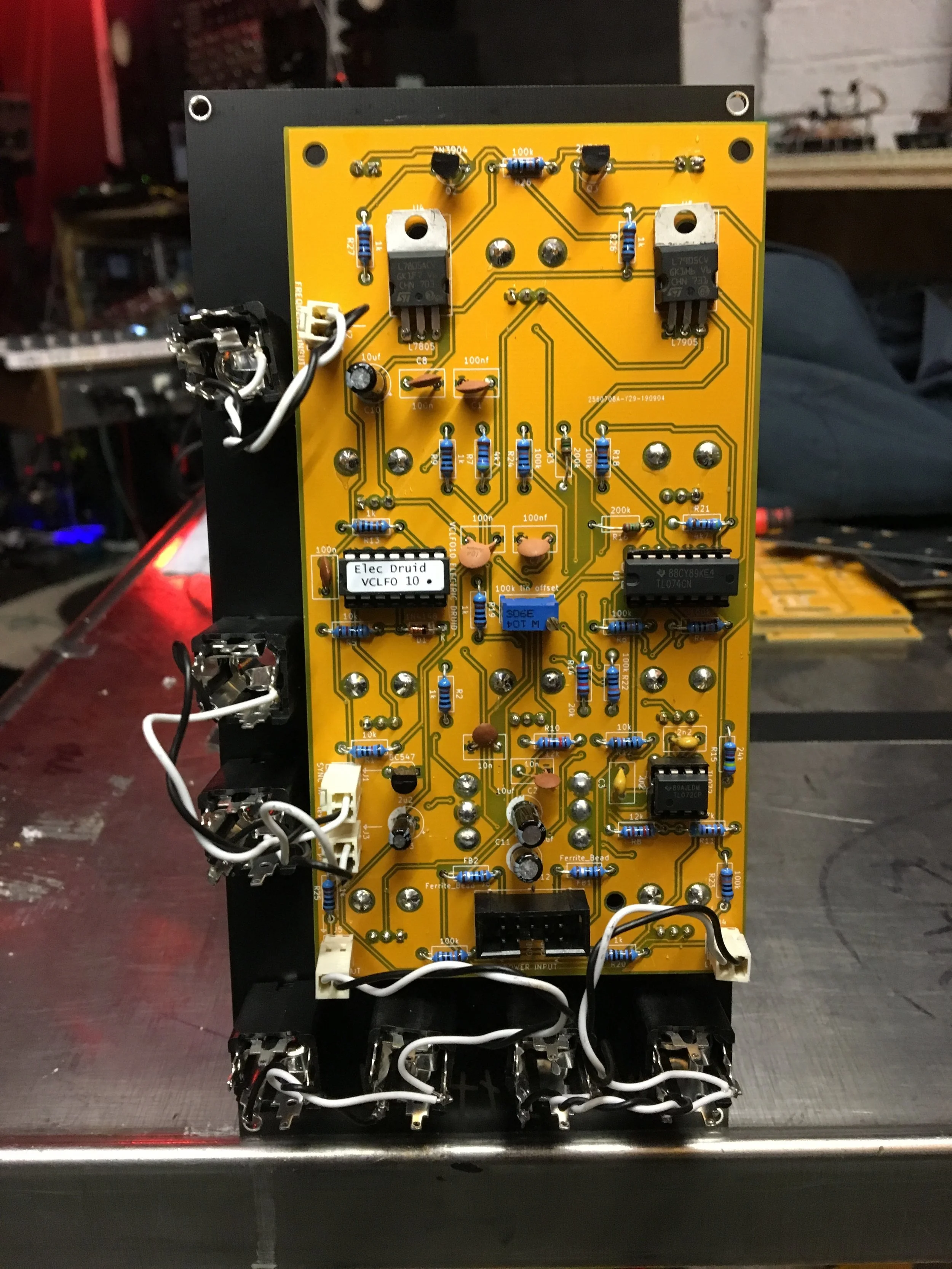 Read through the VCLFO datasheet available on the electric druid site to get to the bottom of what is actually happening! including lists of waveforms etc. if you havent got a multimeter Adjust the trim pot at the rear so the lfo equally swings between the LFO’s . this is down to tast. but its good to plug it into an oscillator and turn up the level, if it sounds like the oscillator is just wobbling on the same note its bang in the middle!! adjust that preset pot so when you turn on vibrato it doesnt sound like the note goes overall up or down.